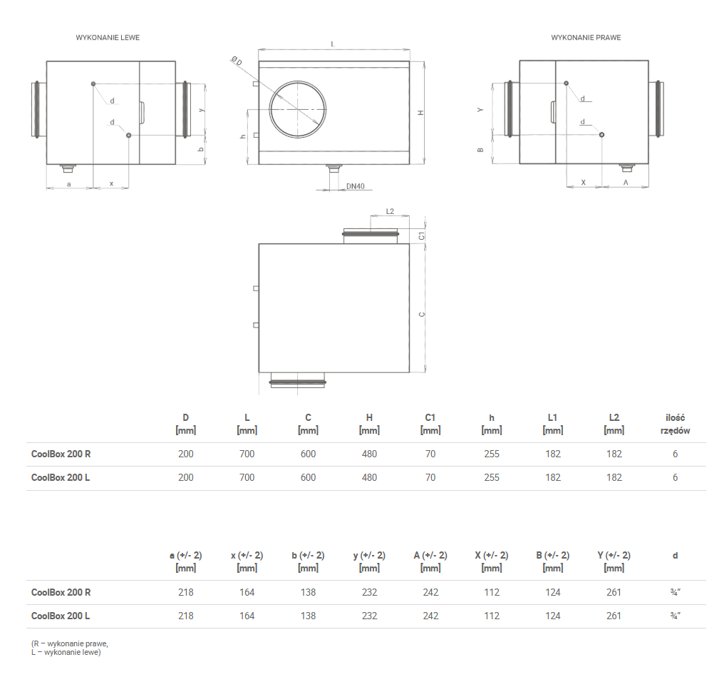 Średnica podłączeń kanałów wentylacyjnych: 200 mm