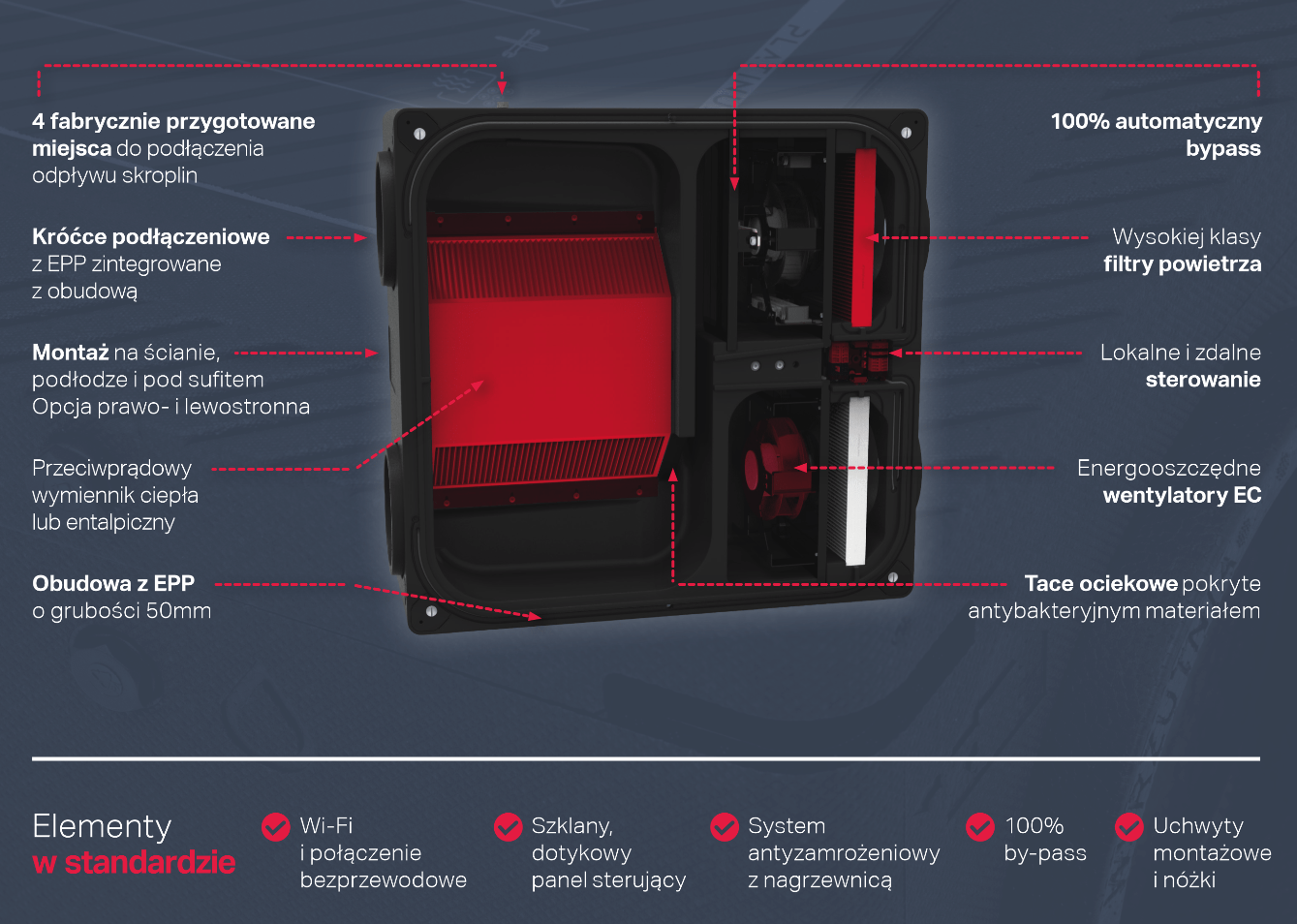 Dodatkowo tace ociekowe pokryte są antybakteryjną powłoką, która zapobiega rozrostowi grzybów, pleśni i bakterii, a w modelu PLATINUM Enthalpy zastosowano entalpiczny wymiennik przeciwprądowy z antybakteryjną i antywirusową membraną.