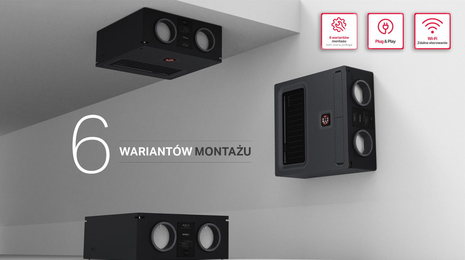 Rekuperator jako jedyny na rynku można zamontować w 6 pozycjach bez wpływu na efektywność jego pracy. Dzięki temu montaż i serwis jest niezwykle prosty. Całość domyka intuicyjny i prosty panel sterowania, który nie wymaga specjalistycznej wiedzy technicznej.