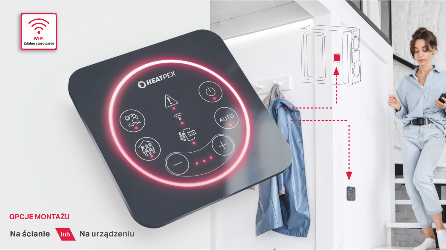 Do sterowania urządzeniem nie jest wymagana ekspercka wiedza. Dotykowy panel sterowania z modułem bezprzewodowego łączenia (dołączany w standardzie do urządzenia) jest prosty i intuicyjny. Zdefiniowane tryby pracy: „wakacje”, „party”, „automatyczny” oraz czujniki automatycznie reagują na niekorzystne warunki w powietrzu i optymalizują pracę jednostki pod względem komfortu, hałasu i zużycia energii.