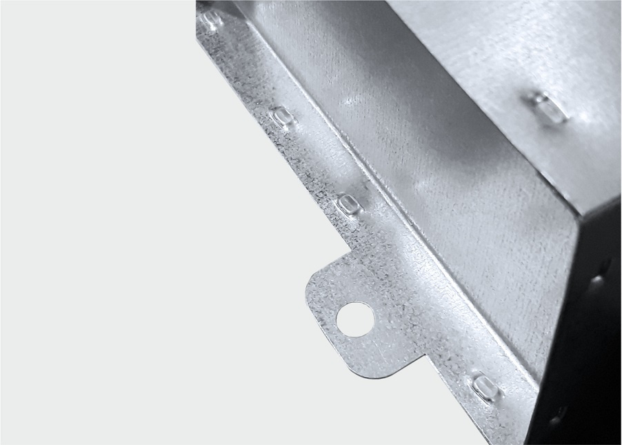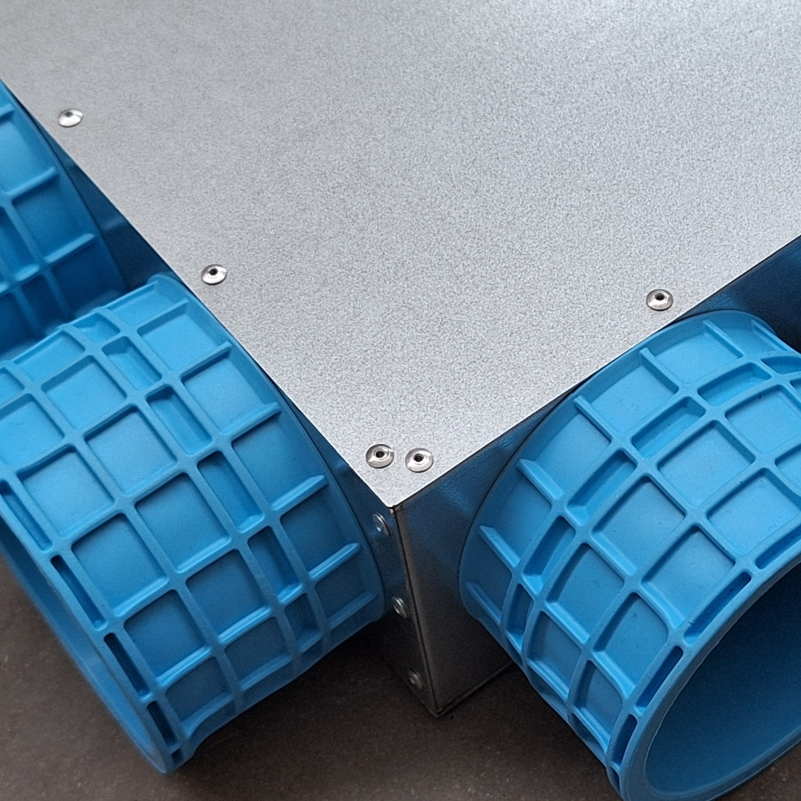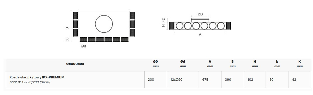Rozdzielacz kątowy jednorzędowy. Wyposażony w króćce przyłączeniowe II generacji IPX-PREMIUM do rur karbowanych. Posiadają one wbudowane 2 uszczelki i nie wymagają stosowania dodatkowych uszczelek na rurę. Stalowy króciec przyłącza kanału również z wbudowaną uszczelką. Elementy korpusu łączone za pomocą nitowania.