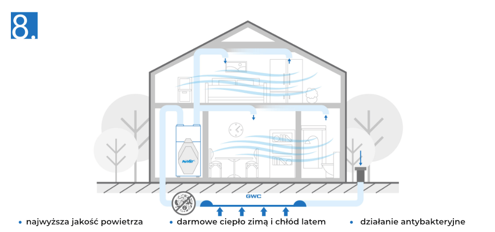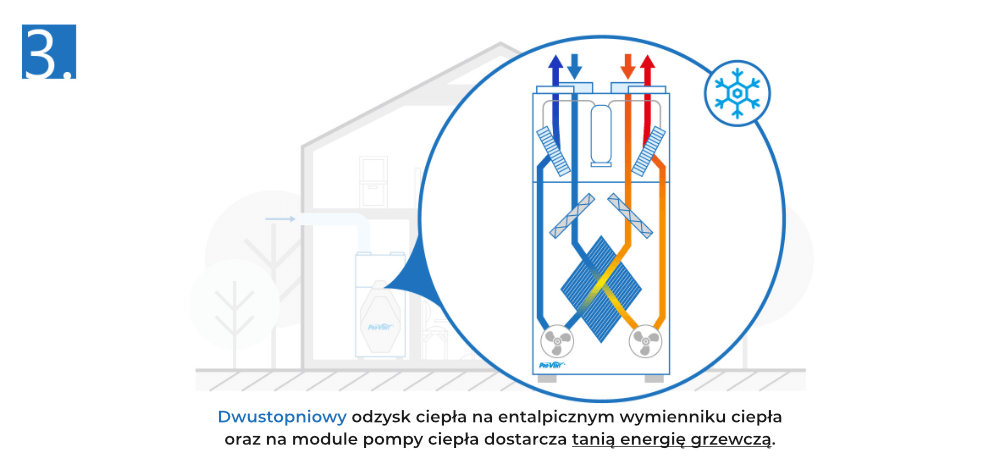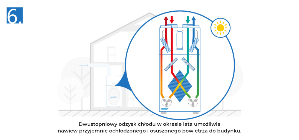 Innowacyjna funkcja przygotowania powietrza wentylacyjnego dzięki zastosowaniu dwuetapowego odzysku ciepła i chłodu w niezwykle wydajny sposób oszczędza energię zimą i latem. Ogrzewanie pomieszczeń realizowane jest przez nadmuch ciepłego powietrza wentylacyjnego. Chłodzenie pomieszczeń następuje poprzez free-cooling oraz pracę pompy ciepła typu powietrze-powietrze.