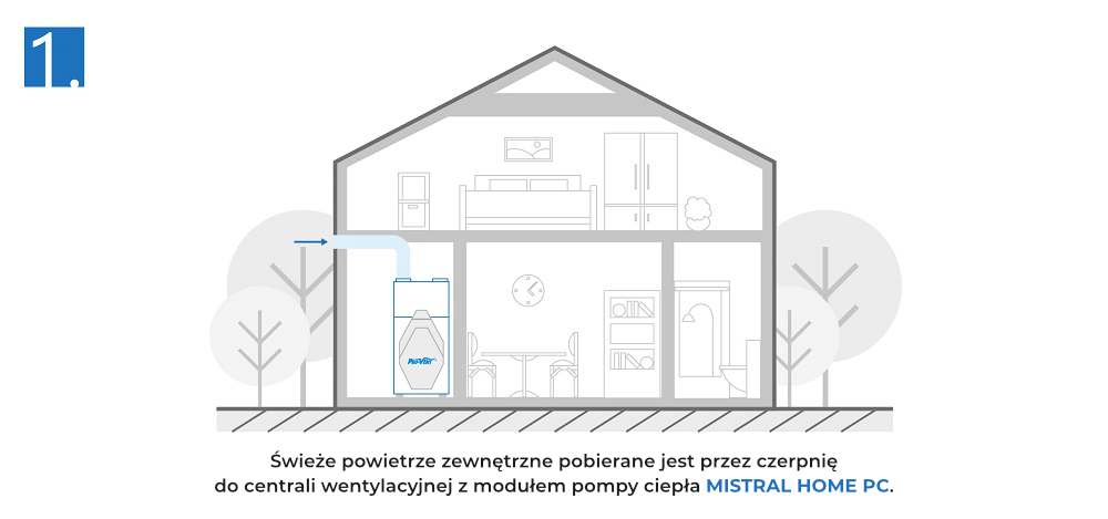 Centrala wentylacyjna ze zintegrowanym modułem pompy ciepła MISTRAL HOME PC dostarcza do budynku świeże, czyste powietrze o odpowiedniej temperaturze, dostosowanej do warunków panujących na zewnątrz. Co to oznacza w praktyce? W okresach niskich temperatur zewnętrznych MISTRAL HOME PC podgrzewa powietrze nawiewane do budynku, latem zaś ochładza i osusza ciepłe i wilgotne powietrze zewnętrzne dbając o odpowiednią temperaturę w pomieszczeniach.