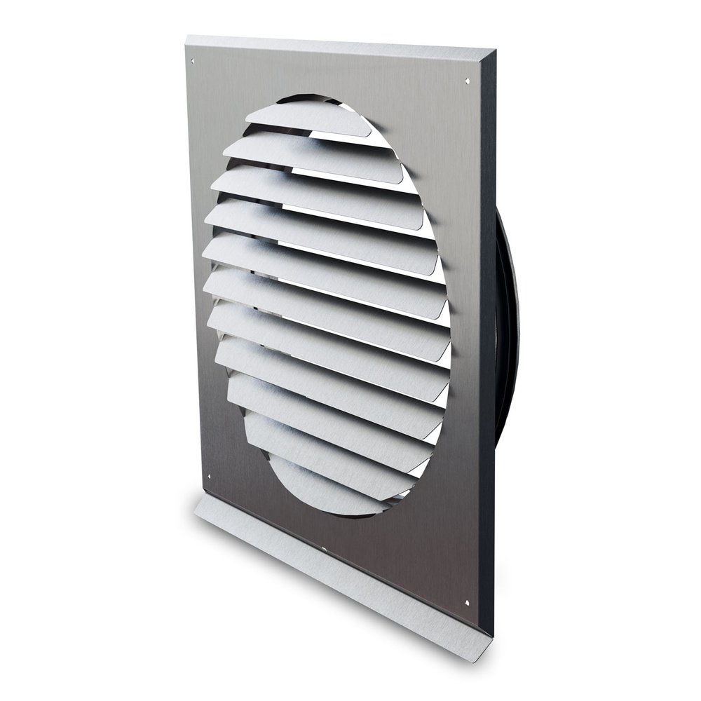 Płaskie czerpnie-wyrzutnie powietrza PEFLEX , wykonane z wysokiej jakości szczotkowanej stali nierdzewnej (INOX) w wersji z okapnikiem – rekomendowane do montażu pionowego na elewacji, skutecznie zapobiegające powstawaniu zacieków na ścianie budynku.