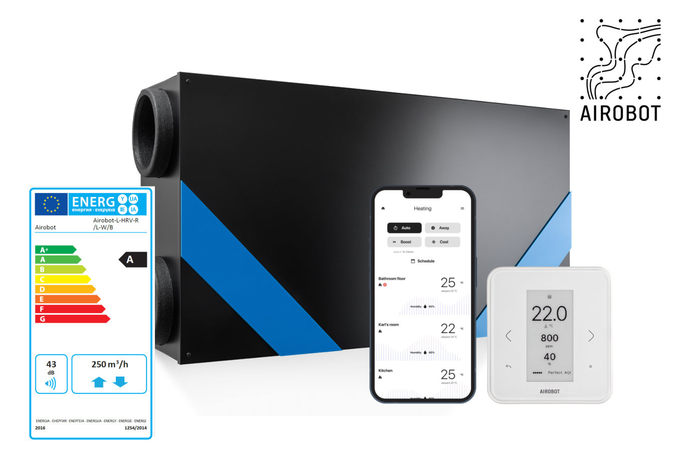 AIROBOT to nowoczesne centrale wentylacyjne z odzyskiem ciepła – rekuperacją z czujnikami: stężenia CO2, poziomu zanieczyszczeń PM, temperatury, wilgotności i jakości powietrza VOC. AIROBOT może dodatkowo sterować modułem nawilżania i ogrzewaniem podłogowym.