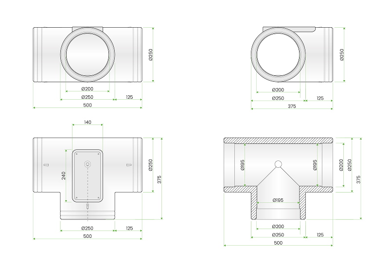 Każdy z trzech króćców trójnika pozwala na podłączenie rury EPS Ø160 mm (wprowadzanej bezpośrednio do wnętrza trójnika, z zaleceniem dodatkowego uszczelnienia) lub Ø200 mm (przy użyciu systemowej mufy EPP). Takie rozwiązanie zapewnia pełną elastyczność w projektowaniu instalacji – możliwe jest jednoczesne rozdzielenie strumienia powietrza oraz redukcja średnicy, np. z Ø200 mm na dwa kanały Ø160 mm.