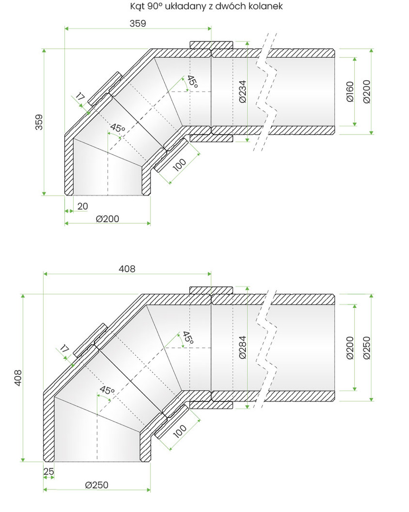Kolano PEFLEX EPS 2.0 45° to element systemu rozprowadzania powietrza PEFLEX EPS 2.0, dostępny w dwóch wariantach średnicy wewnętrznej: Ø160 mm (ścianka 20 mm) oraz Ø200 mm (ścianka 25 mm).